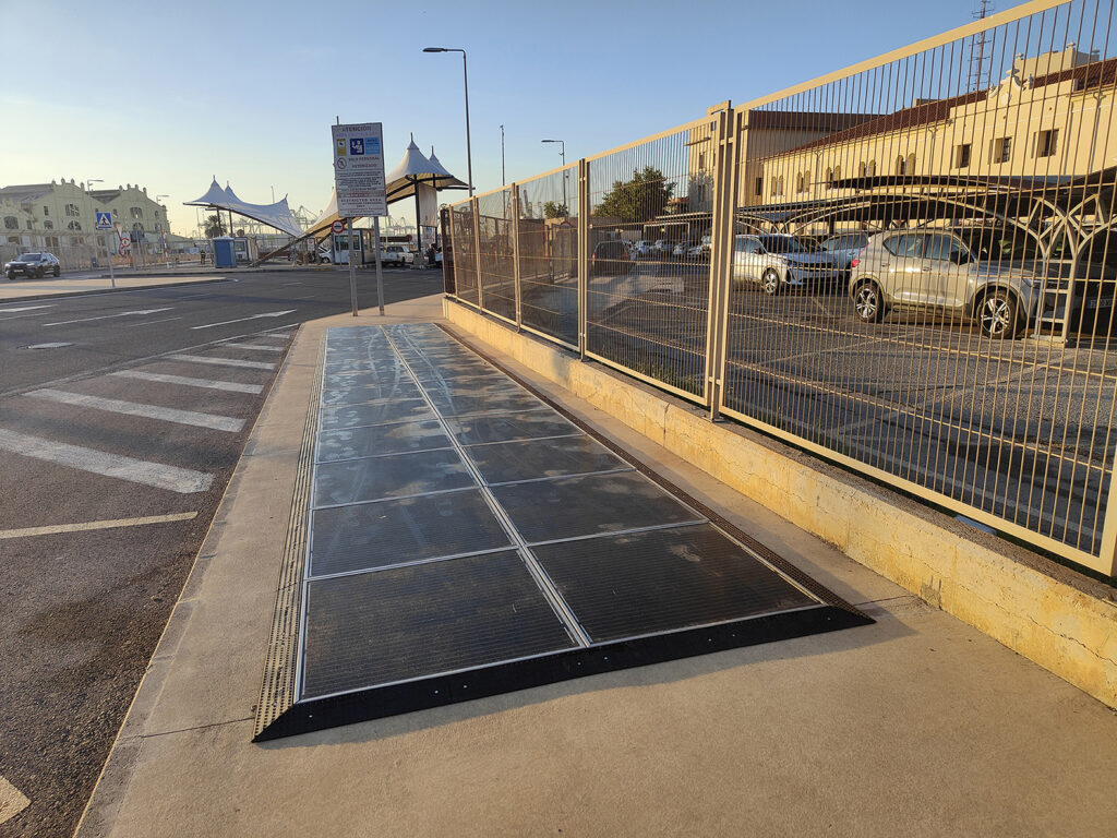 The panels, measuring 1 meter by 1 meter and 34 millimeters thick, have been installed on the sidewalk leading to the main parking lot of the Port Authority of Valencia (APV). They are completely safe for pedestrian use: they comply with UNE anti-slip regulations and are designed to withstand continuous foot traffic. Each unit has a peak power of 200 W, with a voltage of 47 V and a current of 5.8 A.