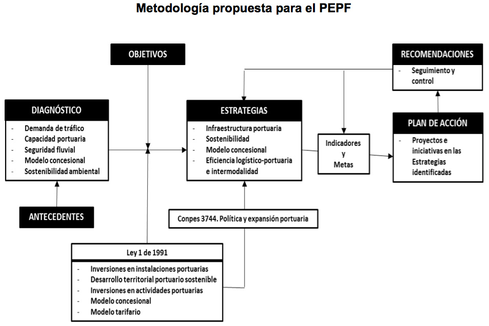 La metodología consensuada contempla que tanto para la elaboración del PAF como para el del PEPF se enmarque en un proceso participativo del conjunto del Clúster vinculado a la actividad relacionada con el Río Magdalena. Asimismo, se sugiere el empleo de la herramienta de gestión estratégica conocida como Balanced Scorecard o Cuadro de Mando Integral CMI) que facilita el ejercicio de concreción de los objetivos estratégicos vinculados a las estrategias y que a partir de indicadores permite evaluar el avance en las metas conforme se desarrollan los proyectos que conformarán el correspondiente plan de acción. En el caso del PEPF, el proceso se ilustra en el esquema siguiente.